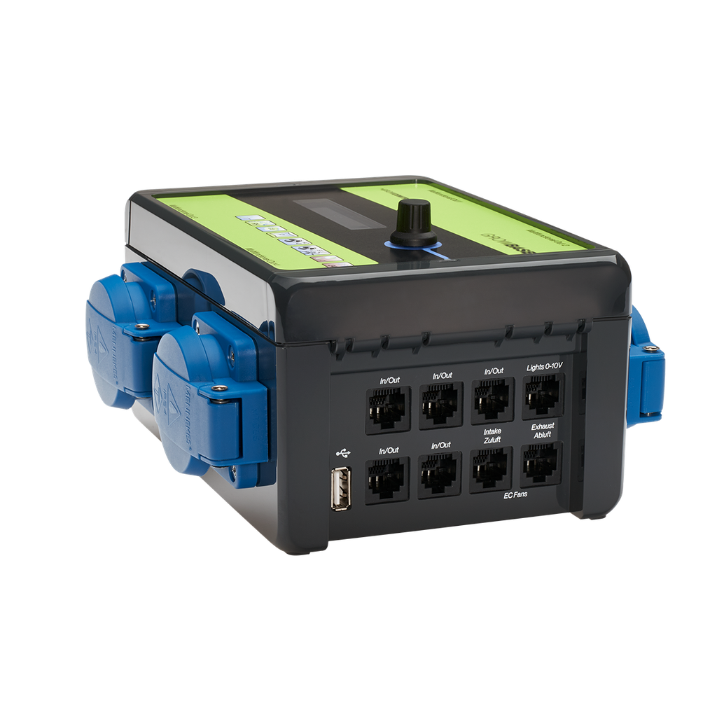 GrowBase WiFi ist die Schaltzentrale für den ambitionierten Indoor-Gärtner. Es können verschiedene Geräte und Sensoren angeschlossen werden. Die vier Steckdosen ermöglichen den Betrieb unterschiedlicher Geräte, da sie auf verschiedene Funktionen eingestellt werden können. GrowBase WiFi ist zur Ansteuerung von EC- und AC- Ventilatoren gleichermaßen geeignet. Damit ist höchste Flexibilität garantiert.