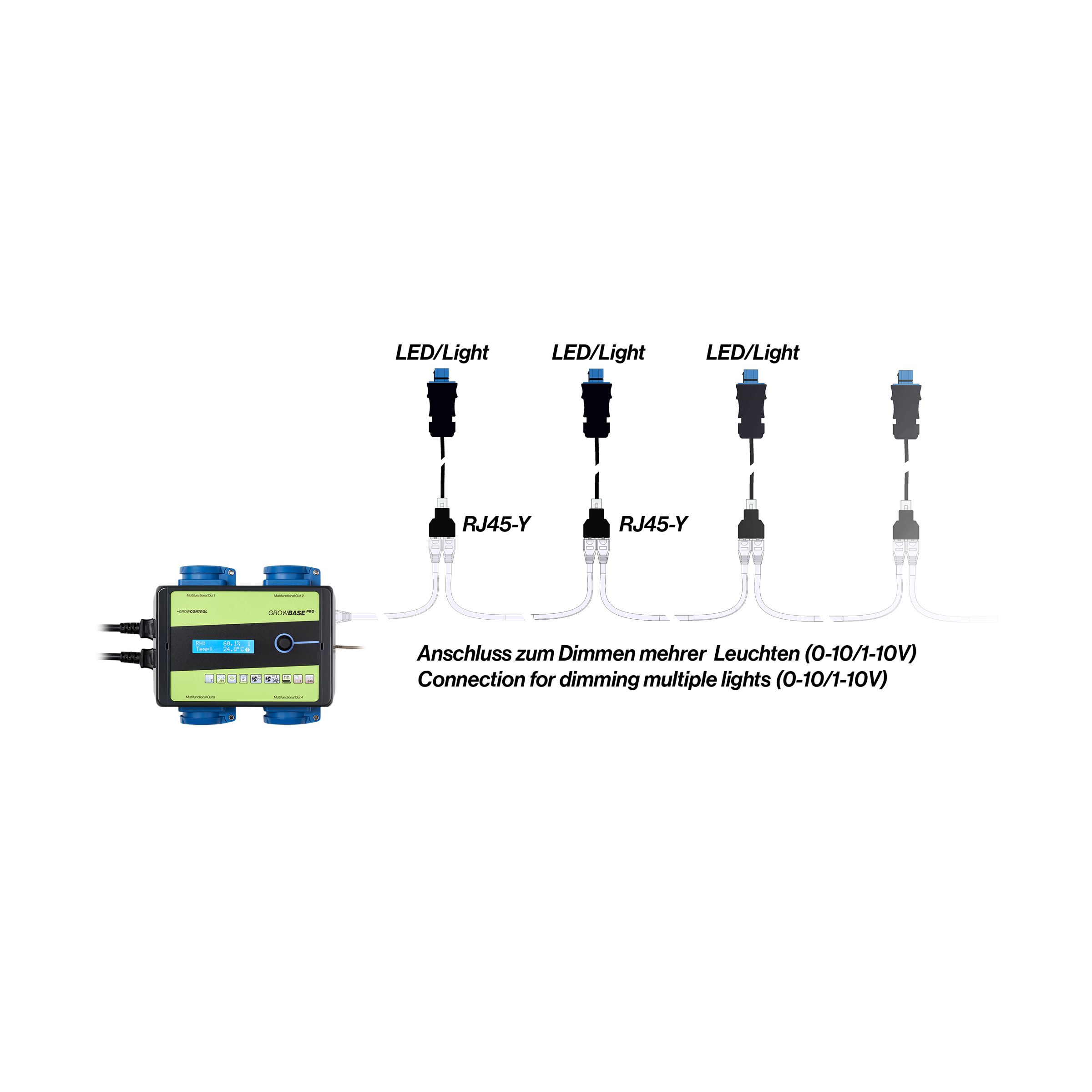 Mit dem RJ45-Y-Stück können mehrere dimmbare Leuchten oder mehrere EC-Ventilatoren an einen Ausgang am Controller angeschlossen werden. (0-10/1-10V, EC-Fans)
