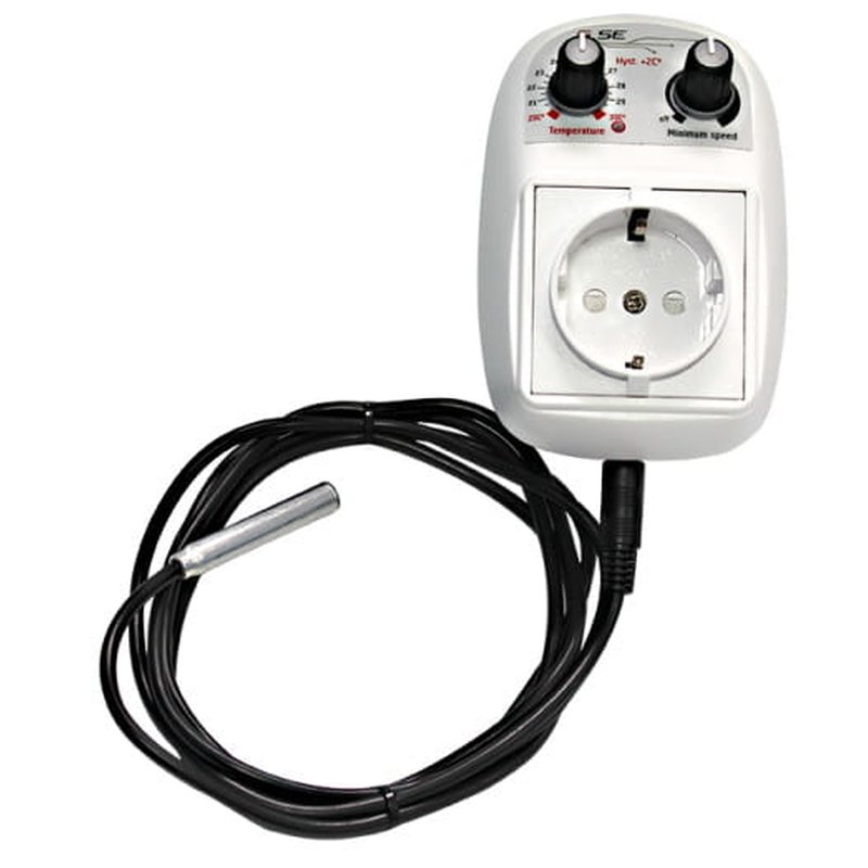 Der Regler hält die Temperatur konstant und verhindert, dass die eingestellte Minimaldrehzahl unterschritten wird. Er kann leicht gesteuert werden, indem die erforderliche Temperatur und die Mindestgeschwindigkeit mit den zwei Knöpfen eingestellt wird.
